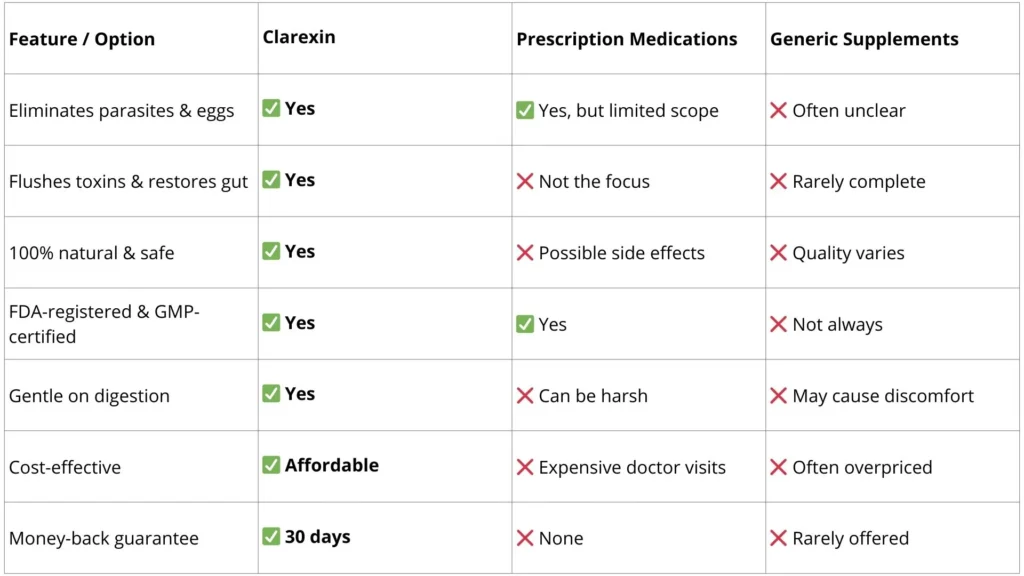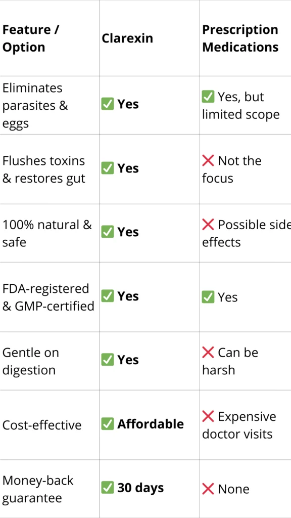 Prescription treatments often target only specific parasites and may come with strong side effects. Generic herbal cleanses, on the other hand, may not use clinically backed ingredients or proper dosages. Clarexin stands out because it’s a complete, natural solution that not only eliminates parasites but also helps restore gut health, strengthen immunity, and improve energy — all while being gentle on the body.